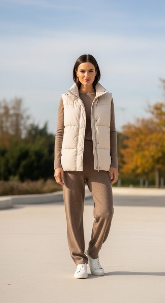 Vests are back as dynamic layering pieces. Whether it’s a sporty puffer vest or a refined knit vest, adding one over a long-sleeve top paired with knit trousers creates rich textures and visual intrigue—a perfect solution for unpredictable weather.