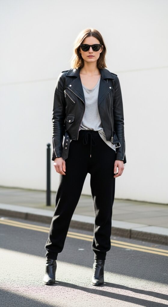 Underneath, wear a minimalist tee or tank, slip into your knit trousers, and finish with ankle boots for the ultimate street style. Keep jewelry understated—a delicate necklace or small hoops are enough. This look is fantastic for concerts, casual dinners, or anytime you want to channel iconic confidence. Pro tip: opt for combat boots over loafers to nail this vibe.
