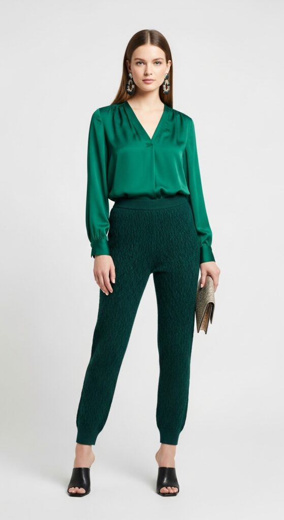 Go for deep jewel tones—like emerald, burgundy, or rich navy—to make a statement. Tuck the blouse into your high-rise trousers and complete the look with heeled mules or strappy sandals. Finish with expressive earrings and a chic clutch for effortless “smart casual” vibes. Best of all, this outfit offers maximum comfort throughout the evening, so you can engage fully without distraction.