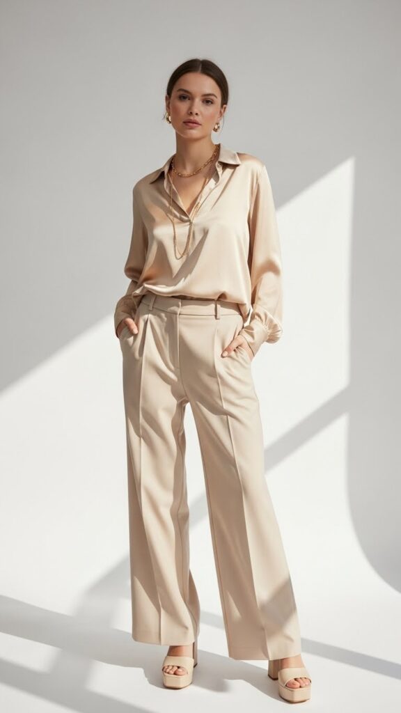 Flowy Silk Tops Complementing Wide-Legged Pants