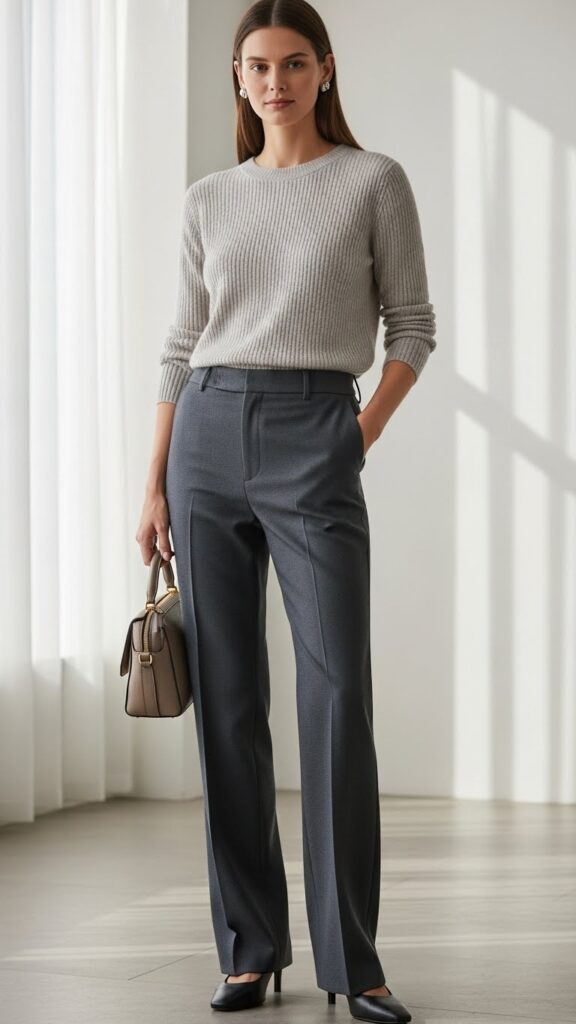Seek knitwear with subtle design features—like a bateau neckline, fine ribbing, or a slight shimmer—to keep the look from feeling too relaxed. The clean lines of straight trousers offset the softness, crafting a silhouette that’s polished without feeling overdone. Tuck your top fully or partially, add a structured handbag, and include simple stud earrings for a complete, sophisticated finish.