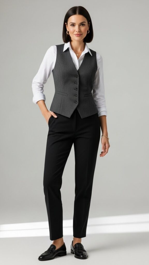 Embrace a stylish layering approach with a tailored vest worn over a collared shirt combined with trousers for a look that fuses masculine tailoring with feminine polish. This modern ensemble brings a kind of cinematic flair reminiscent of iconic film aesthetics.
