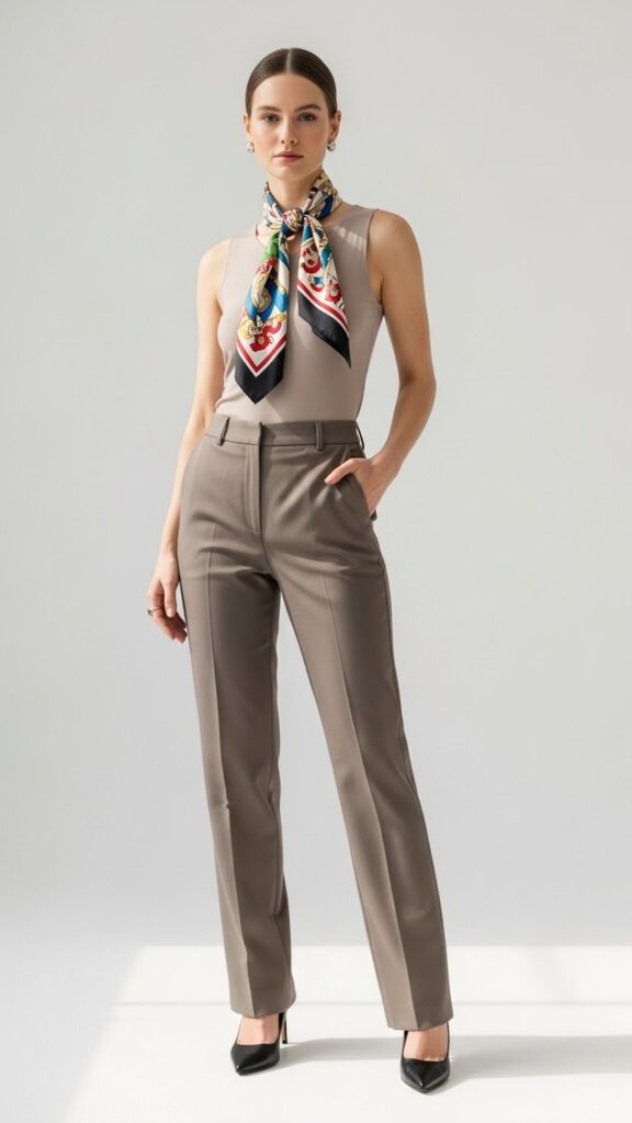 Parisian Flair with a Silk Scarf and Classic Trousers