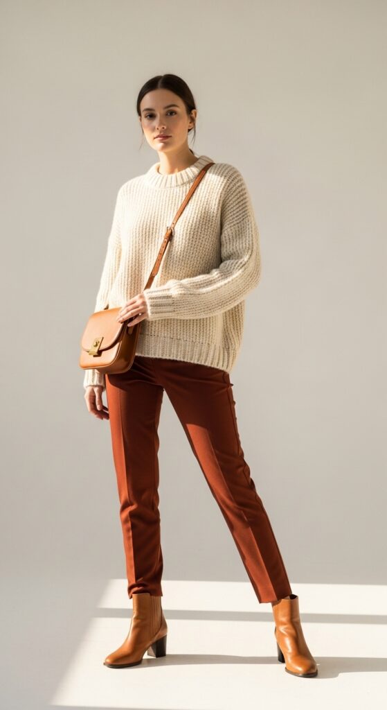 Combining rust pants with a thick, cream-colored knit evokes an instantly put-together yet cozy look—even on your most hectic days. This outfit blends warmth and elegance effortlessly, creating a refined yet inviting silhouette without any fuss. Pair with cognac ankle boots to complete a versatile ensemble ideal for everything from casual meetups to weekend errands.