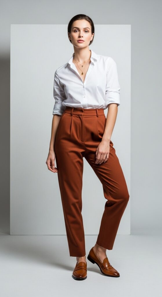 For fans of timeless European style, tucking a sharp white button-down into rust trousers channels effortless sophistication. Coupled with leather loafers, this look channels subtle Riviera vibes—refined but approachable.