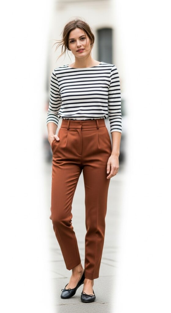 Embracing the timeless French-girl aesthetic remains eternally chic. Pairing rust trousers with a classic striped long-sleeve top—ideally Breton stripes—strikes the ideal balance of casual polish. Complement this with black or nude ballet flats for an effortlessly elegant look.