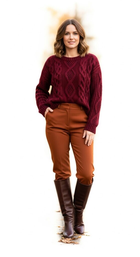 Combining burgundy and rust might seem like a lot of warmth, but when done right, it’s absolutely captivating. A cozy burgundy sweater paired with rust trousers forms a rich, harmonious palette perfect for autumn’s embrace. Add knee-high boots in complementary tones like brown, black, or matching burgundy for an impressive silhouette.