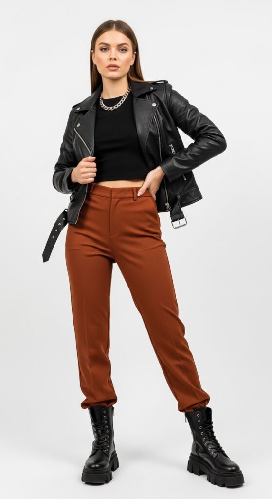 For those drawn to a rebellious aesthetic, pairing rust pants with a black leather jacket and chunky combat boots injects instant urban cool. This styling proves rust trousers transcend the cozy fall stereotype and can deliver fierce, street-style-ready looks.