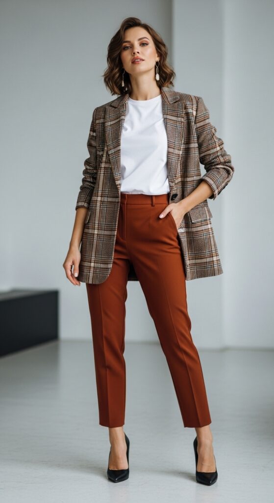 Fall and plaid are timeless companions. Teaming a plaid blazer—preferably oversized—with rust trousers brings a modern, polished edge. Layer over a simple white tee or black bodysuit and finish with pointed-toe heels for a look that’s equally at home in the boardroom or after-hours.