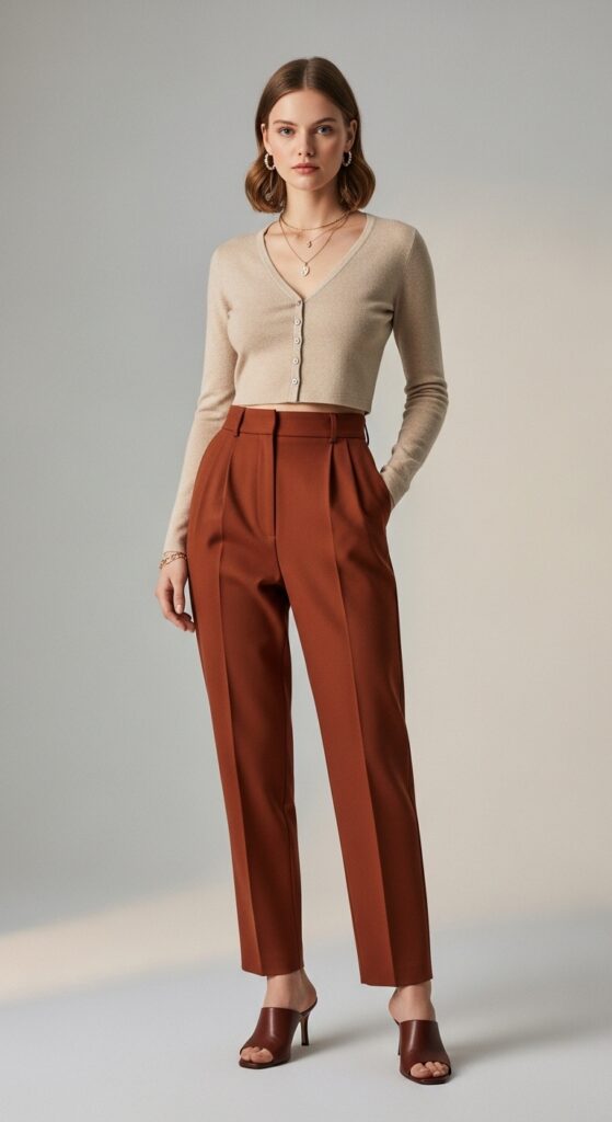 A cropped cardigan paired with high-rise rust trousers creates a flattering silhouette that emphasizes the waist without effort. Complete this feminine yet grounded outfit with heeled mules in neutral or contrasting earth tones for polished but approachable style.