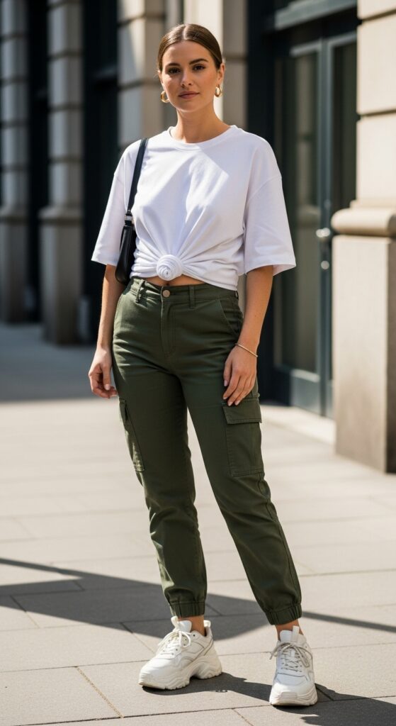 Sometimes, simplicity speaks volumes. Pair a roomy white t-shirt tucked just in the front into your army green pants with your favorite chunky sneakers for an outfit that’s pure street-style perfection. The crisp white tee contrasts beautifully with the earthy green shade, delivering an on-point look that’s casual yet polished.