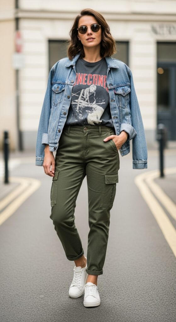 A vintage-inspired graphic tee tucked into army green trousers and layered with a classic denim jacket is style made easy. This combo feels effortless but is unmistakably cool.