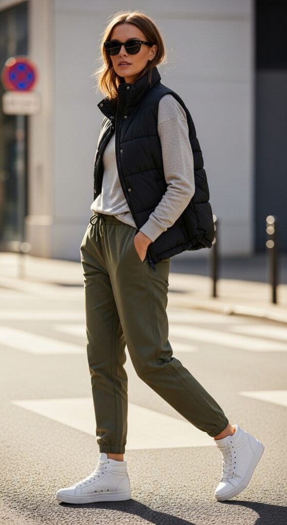 Layering for those tricky days when the weather can’t decide is an art, and a puffer vest over a long-sleeve tee paired with army green trousers nails it. This combo offers warmth without overwhelming bulk and lends an athletic yet chic flair.