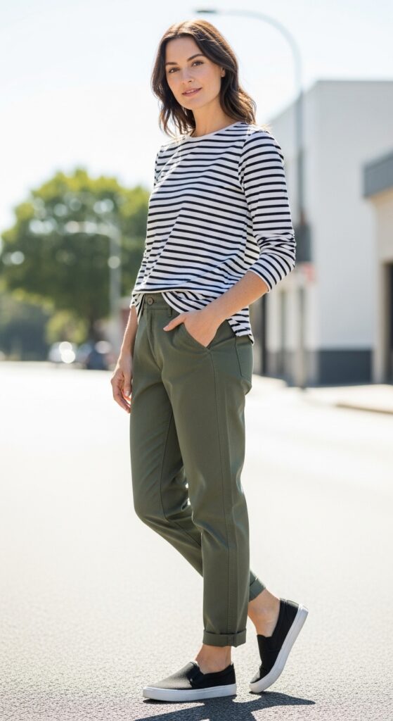 When simplicity and style collide, a striped tee (think iconic Breton stripes) paired with army green pants and slip-on sneakers becomes your go-to outfit. It’s visually appealing without any fuss, and the sneakers are the ultimate in casual comfort.