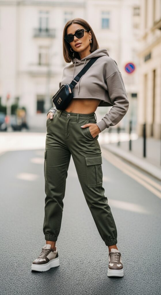 To wrap up, nothing embodies urban style better than a cropped hoodie paired with army green pants and chunky platform sneakers. The cropped top adds a hint of playfulness by revealing a glimpse of midriff or simply highlighting your high-waisted trousers.