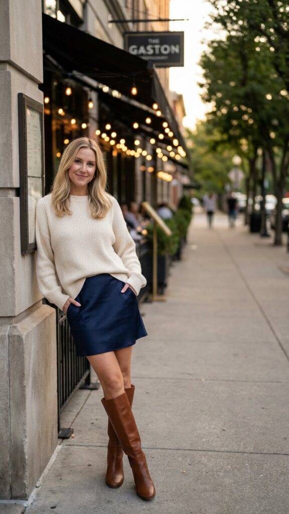 Shoes-wise, knee-high boots bring a timeless flair, but ankle boots or even loafers add a hint of unpredictability to your outfit. If cooler weather calls for it, layer with opaque tights. This look radiates playful sophistication, perfect for casual group dinners or lighthearted date nights where you want to feel both flirty and polished.