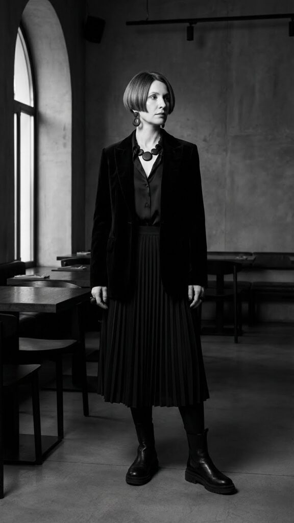 Finish the look with chunky lace-up boots or slender heels to match your mood, pile on golden accessories for a luxe effect, and layer with outerwear that provides both warmth and style. Whether you’re dressing up for a swanky dinner or stepping into a casual wine bar, this combo nails that balance between comfort and statement-making.
