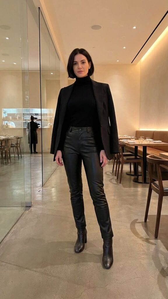 My go-to pairing: leather pants with a neatly tucked-in turtleneck and heeled boots, topped with gold jewelry and a long coat if it’s chilly. This look suits special dinners, celebrations, or any moment you want to channel your inner cool-girl with confidence. Keep in mind, confidence is key when rocking leather pants—you’ll wonder why you held back so long.