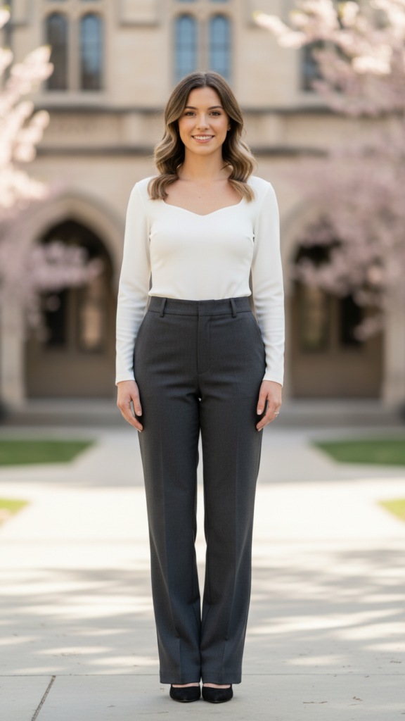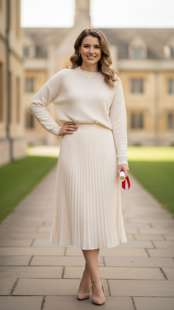 Select skirts in refined shades such as charcoal, navy, or cream, accented with a belt to showcase your waistline. Your cashmere piece should feature a classic neckline—either a modest crew or V-neck—in complementary tones. This refined convocation outfit pairs perfectly with pointed flats or subtle block heels, providing comfort during long ceremonies without sacrificing sophistication.