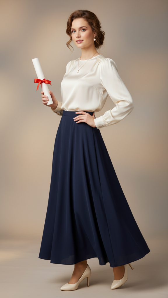 Marrying a classic A-line skirt with an elegant silk blouse lends a refined touch to your graduation attire, perfectly fusing professionalism with a festive vibe. This pairing accentuates virtually every figure while maintaining a polished look throughout your milestone event.