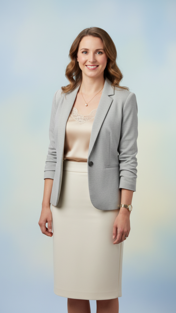Opt for a knee-length pencil skirt in classic tones like black, navy, or charcoal, paired with a luxurious silk camisole for texture and comfort. Layer with a blazer designed to accentuate your waist for a polished appearance. Creating a monochromatic palette enhances visual harmony and lends an elevated aura to your look. Limit accessories to discreet pearl studs and a structured bag to maintain a sleek, elegant profile.