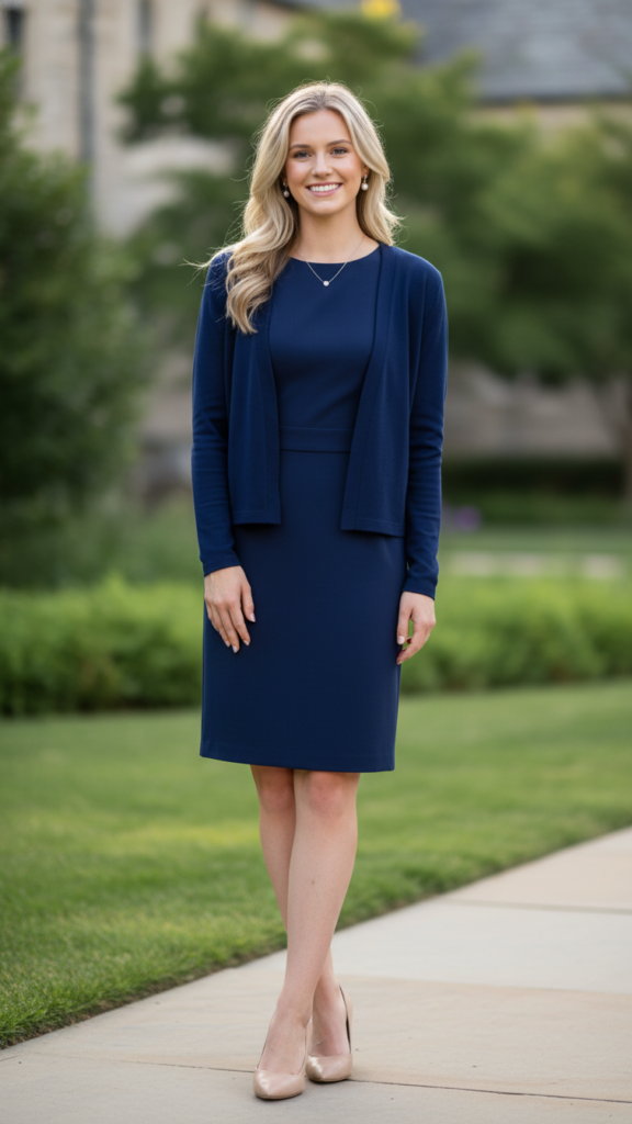 Sleek Shift Dress Paired with a Coordinated Cardigan