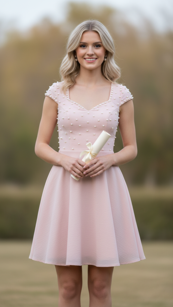 Incorporate pearl accents, whether in the form of delicate buttons, embellishments lining the neckline, or subtle sleeve details, adding an air of polished charm without overpowering your look. Carry the elegance through minimalist accessories, selecting nude pumps, a sleek handbag, and modest stud earrings. This ensemble strikes the perfect balance of sophistication and celebratory spirit, suitable for recognizing your academic triumph.