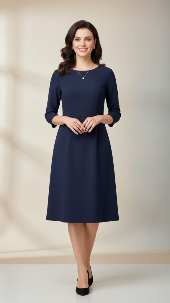 Choose a flared cut that complements your figure while promoting comfortable movement during extended standing and walking. The three-quarter sleeve length balances style with practicality, preventing discomfort without sacrificing refinement. Classic hues such as rich navy, deep burgundy, or forest green not only look elegant but also enhance photo quality when paired with graduation robes. Keep accessories subtle—think delicate studs, a fine bracelet, and supportive low heels—to complete this harmonious, functional look.