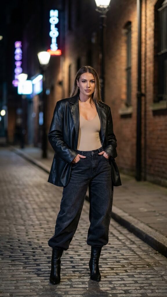 If you want a luxe vibe on a budget, the combo of an oversized leather blazer (faux or genuine) paired with baggy jeans is the answer. This duo balances polished refinement with effortless street style. Layer it with a minimal bodysuit or a cropped top underneath to keep the look streamlined.