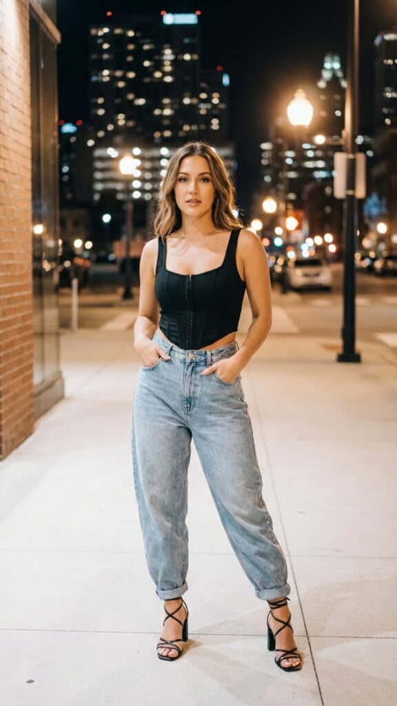 There’s an undeniable chemistry between crop tops and high-waisted baggy jeans. This pairing highlights your silhouette by elongating the legs and revealing just enough skin to keep things playful but tasteful. For nights out, choose bold crop tops in metallic fabric, sequined finishes, or even cozier options like a ribbed halter.