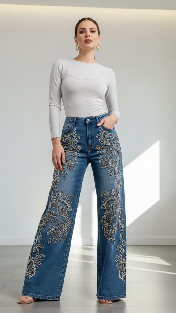 When your jeans are the focal point, choose bold details like flares, embroideries, rhinestones, or unique stitching. Complement these with neutral fitted tops to maintain proportion and let the bottoms shine.
