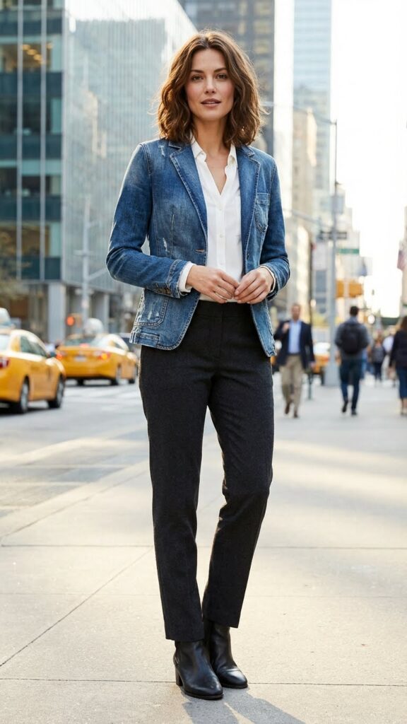 Distressed Denim Blazer Paired with Sharp Trousers