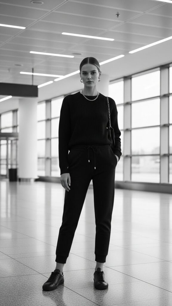 Sometimes the best airport outfits start with tried-and-true black basics—think leggings, hoodies, and sneakers. Amp up the look with a bright puffer jacket, a boldly printed scarf, or a statement handbag for a striking contrast. This minimalist foundation lets your single standout piece shine while maintaining all-day comfort. Feel free to switch up your accent piece depending on mood or flight destination.