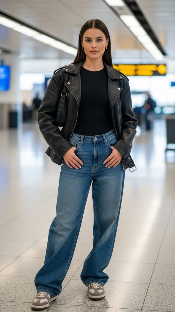 Baggy denim makes a casual airport statement. Pair loose, comfy jeans with a snug bodysuit or tank for balanced proportions. Layer up with a leather or denim jacket and top it off with trendy footwear like white sneakers or polished loafers. This easygoing combination delivers an understated, fashion-forward look that’s perfect for any layover or long flight.