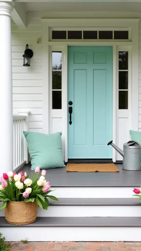 Complement this with a handcrafted spring wreath featuring tulips or daffodils, and frame your entrance with lush potted plants to achieve a balanced, inviting entryway.