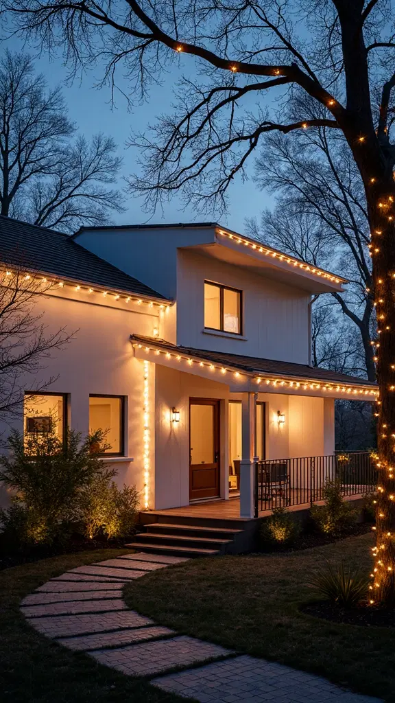 This technique accentuates the natural lines of your house, fostering an inviting holiday ambiance that’s both modern and minimal.