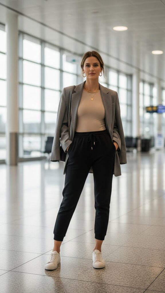 Loafers or ballet flats finalize the ensemble, ideal for travelers who don’t vibe with purely athleisure but still desire comfort and a smart appearance. This outfit effortlessly transitions from boarding gates to business meetings.