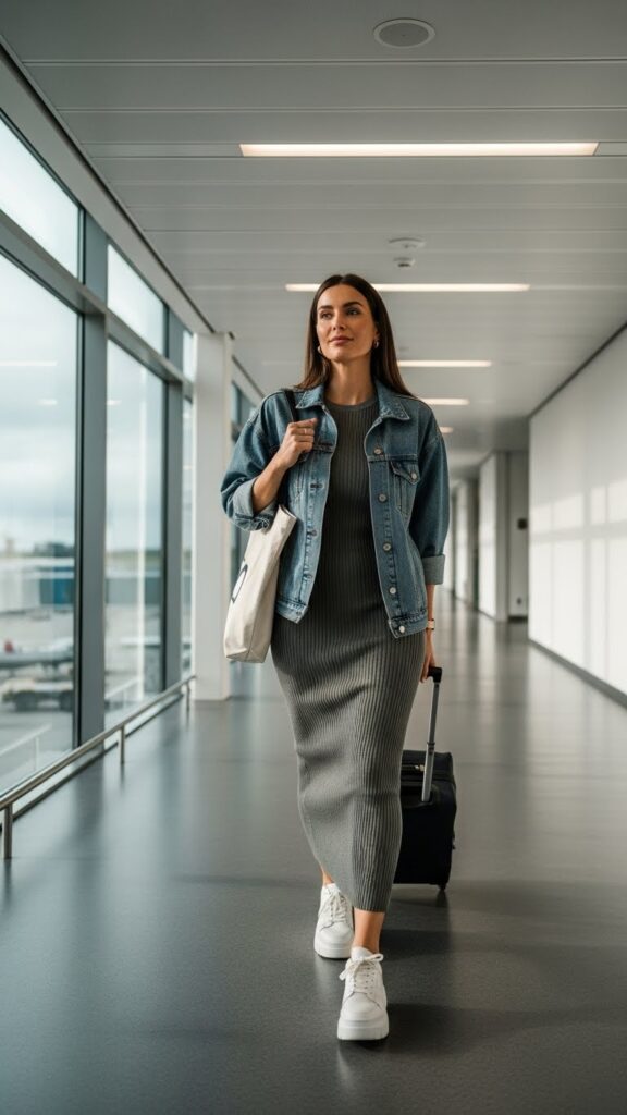 Choose a fitted ribbed maxi dress or a breezy jersey version depending on your preference. Top it off with a denim or faux leather jacket for added warmth, pockets, and a touch of attitude. Balance the look with platform sandals or low-profile sneakers for a seamless transition from terminal to arrival.