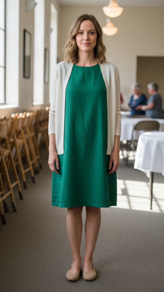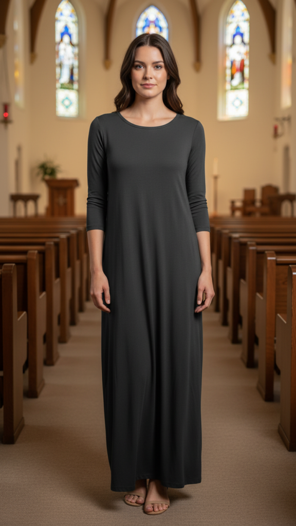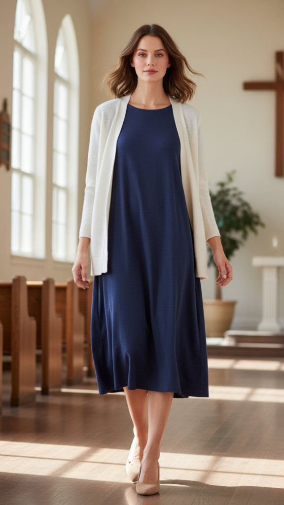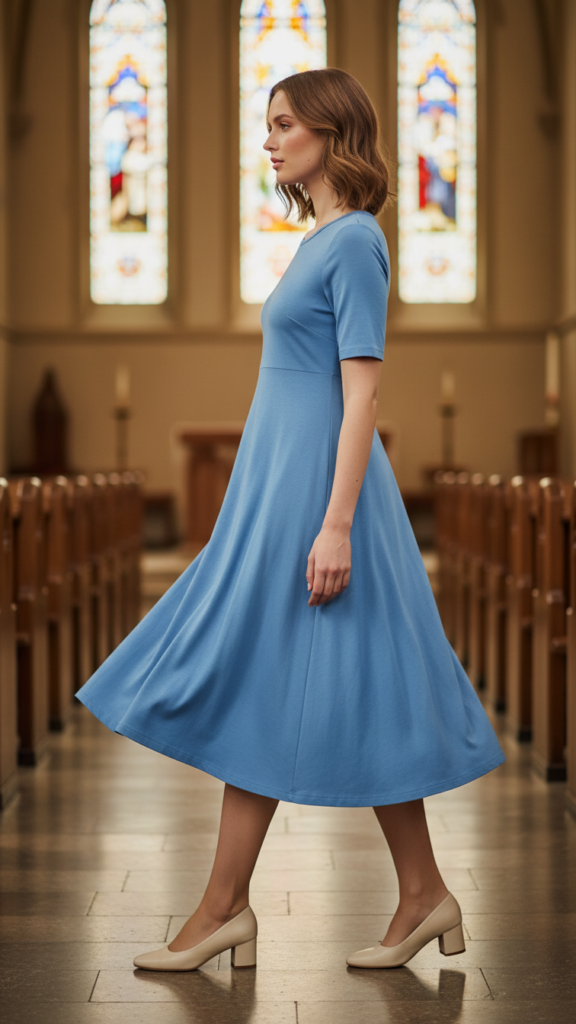 Select hem lengths that fall at the knee or below in shades like deep green, navy, or burgundy. Pair with light cardigans and comfortable, low-heeled shoes for a look that transitions effortlessly between worship and social time.
