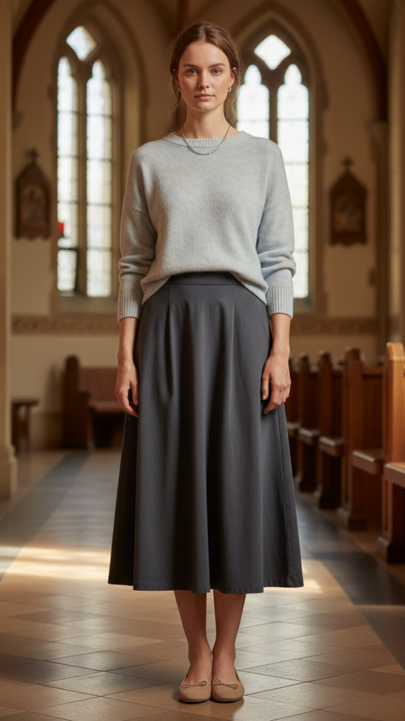 A-line skirts paired with soft, knitted tops provide a timeless, flattering ensemble suitable for most body types. Their flowing nature embraces movement without constriction, perfect for long church sessions.
