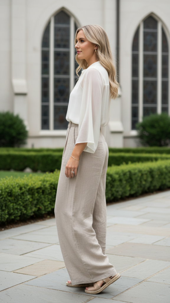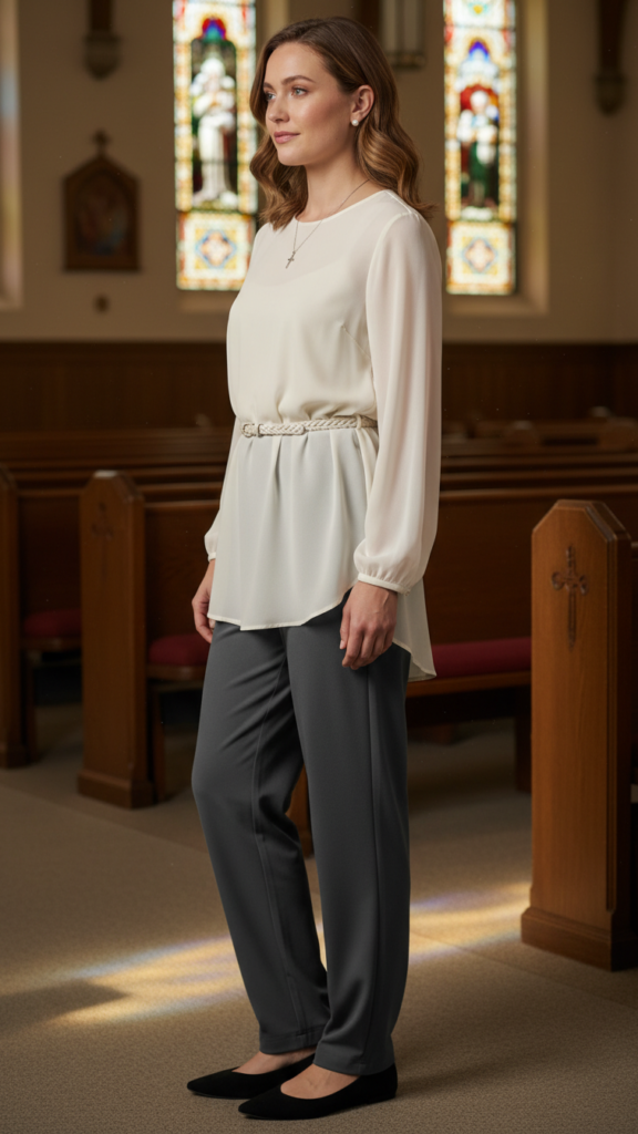 For a blend of grace and ease, flowy palazzo pants styled with a modest blouse present a chic yet comfortable ensemble for worship. Lightweight, breathable fabric such as linen or soft cotton ensures freedom of movement and prevents overheating during lengthy sermons.