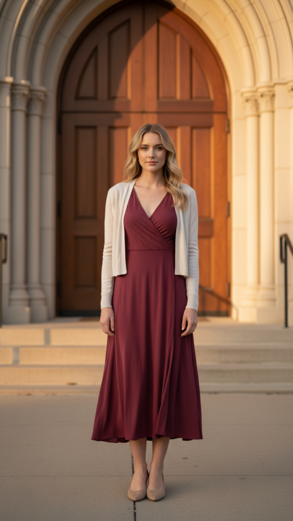 Select dress lengths ranging from knee to midi in neutral yet rich hues like maroon, forest green, or navy to maintain versatility. Pair with classic flats or modest heels, and layer with a cardigan when temperatures dip during services.
