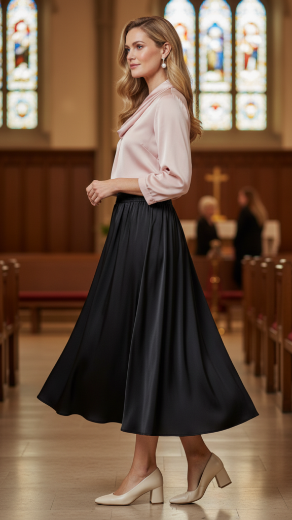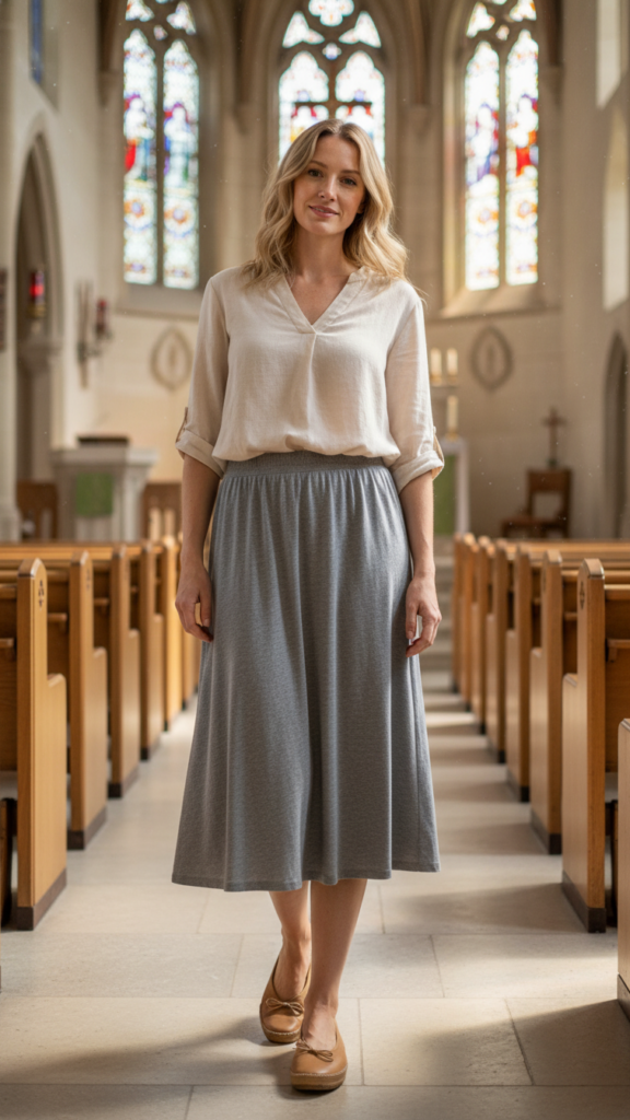 Combining relaxed midi skirts with supportive, cushioned flats offers the ideal blend of style and ease for churchgoers. The flowing design accommodates movement during standing, sitting, and social exchanges without constraint.
