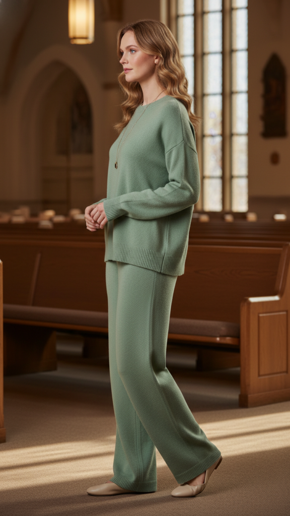 Matching knit sets comprising tops and bottoms in harmonious colors strike the perfect note between comfort and refinement, ideal for prolonged church attendance. These ensembles facilitate free movement while preserving a neat and cohesive appearance.