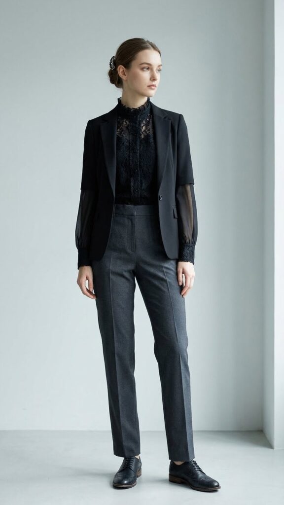 Romantic Gothic Blouse Styled with Sharp Professional Bottoms