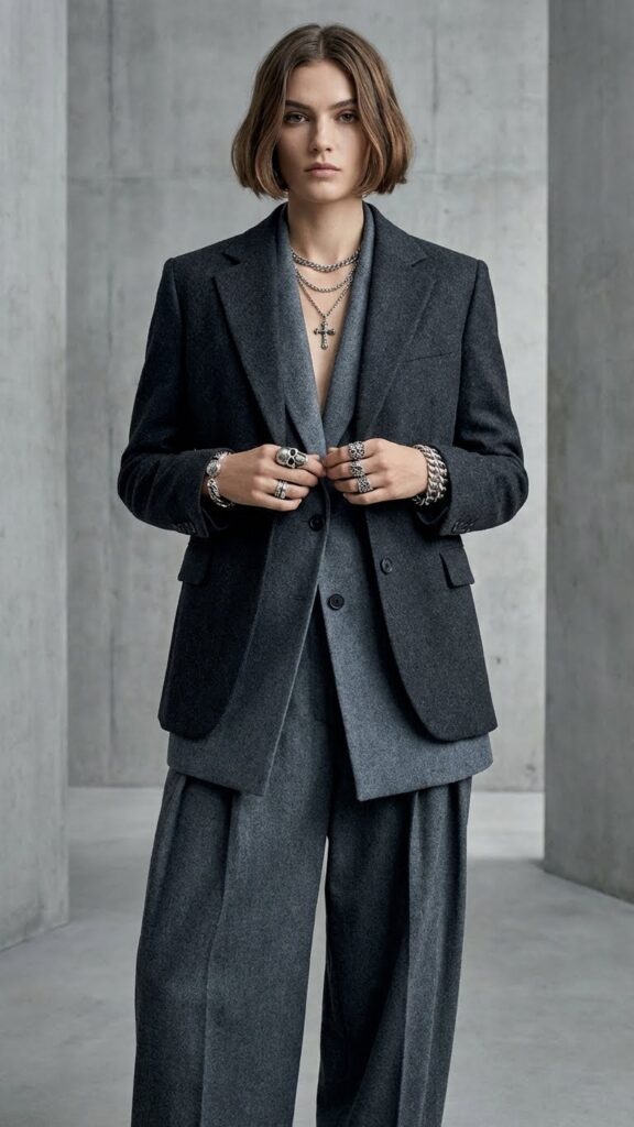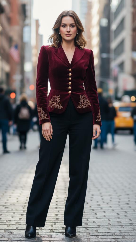 Structured tailoring ensures a commanding presence, while intricate detailing like vintage-inspired buttons or subtle embroidery introduces gothic nuances. High-waisted, wide-leg pants balance the blazer’s dramatic silhouette, achieving a regal look that conveys authority and style in professional environments.