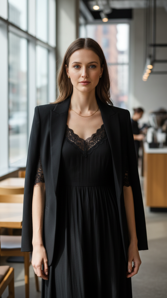 Layering with a sharply tailored blazer featuring defined shoulders and smooth lines tames the softness of the lace, creating a powerful yet graceful ensemble. Drawing inspiration from vintage fashion trends, you might incorporate oversized blazer designs or textured fabrics for added depth and personality.