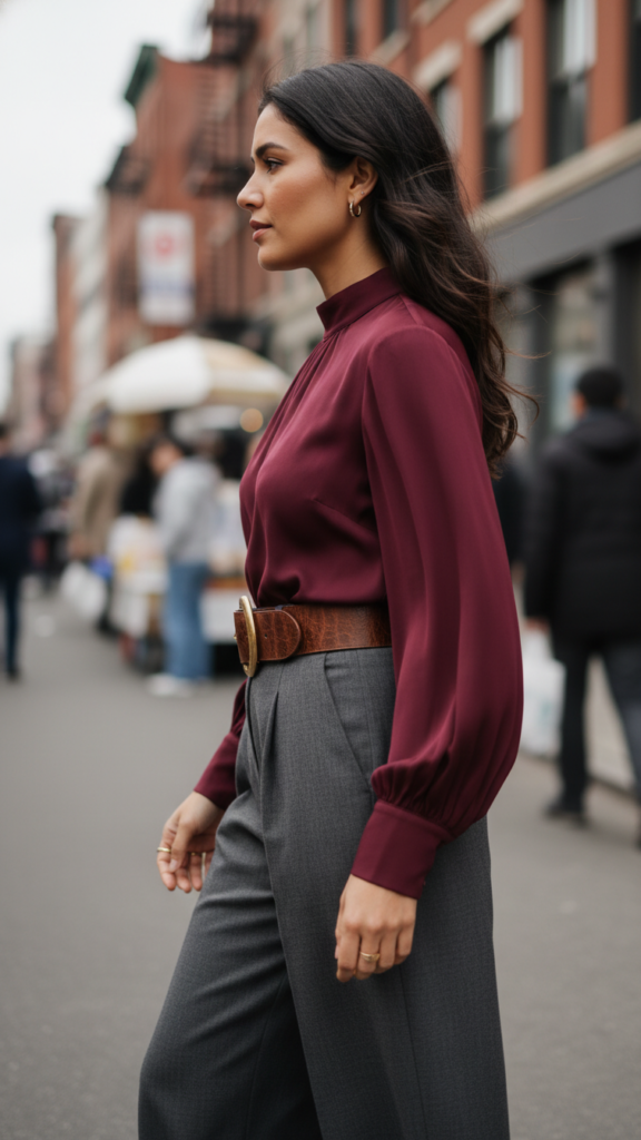 Wide-leg pants with structured cuts offset the blouse’s softness, while a distinctive belt featuring leather or metal embellishments accentuates your waist and injects personality. Jeans styled for work can also benefit from a statement belt upgrade, balancing casual comfort and gothic appeal.