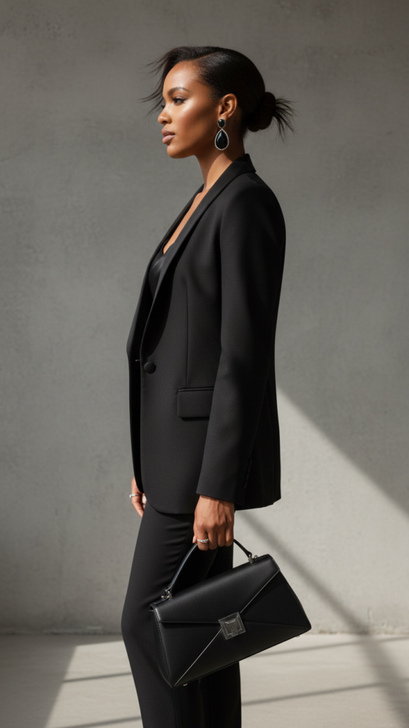 For a refined gothic appearance suitable even in conservative professional settings, a streamlined all-black power suit offers an impeccable base. Prioritize sharp tailoring in matte fabrics that emphasize a clean, authoritative silhouette.