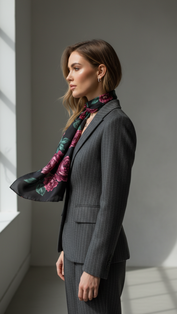 Pinstriped Suit Enhanced by a Dark Floral Silk Scarf